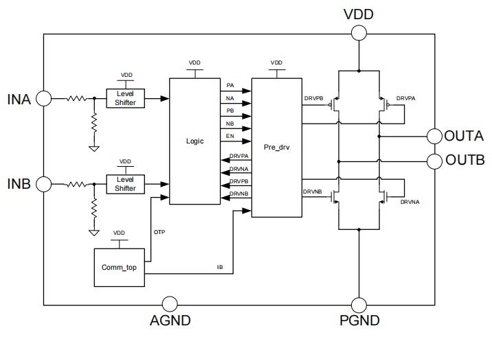 直流有刷電機驅動芯片SS6216支持最高工作電壓為2-7.2V,持續電流1.4A, 峰值電流2A. 同時,內置過熱保護功能和欠壓閉鎖等保護功能。具有一個PWM(INA/INB)輸入接口,支持與行業標準器件兼容。SS6216內置溫度保護功能,當芯片溫度急劇升高,內部電路關斷內置的功率開關管,切斷負載電流。