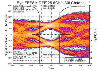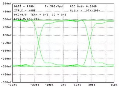如圖所示,在對應28Gbps的頻點上,信號能量被衰減了30db,電壓幅度只剩3%了;在對應56Gbps的頻點上更慘,65db意味著信號電壓擺幅剩下不到千分之一。在這種信道中,發送端一個完美漂亮的數據眼圖: