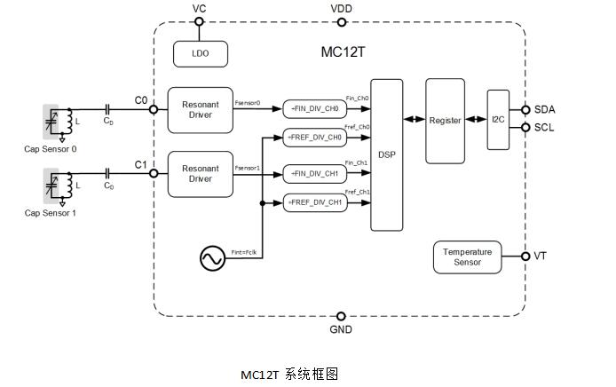 MC12T、MC12G的激勵頻率在10~100MHz范圍內可配置,其頻率測量輸出為16bit數字信號,對應的電容感知較高分辨率為0.5fF。