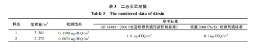 采用“鍋爐熱力焚燒技術”處理該項目廢氣,二氯甲烷、甲苯、二甲苯、乙苯凈化效率分別達到97%、85%、83%、94%以上,非甲烷總烴凈化效率>95%,二惡英排放達到GB18485—2001《生活垃圾焚燒污染控制標準》要求,樣品均值低于歐盟2000/76/EC垃圾焚燒標準。