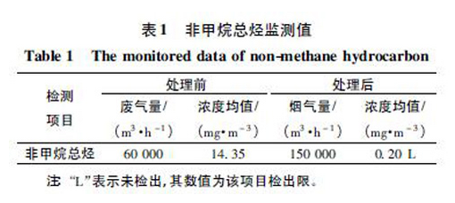 項目正常運行后,由第三方浙江省環境保護科學設計研究院分析實驗室對“非甲烷總烴”指標進行了監測,監測方法參照《空氣與廢氣監測分析方法》(第四版增補版),報告編號為W20130086,處理前后廢氣中非甲烷總烴的濃度見表1。