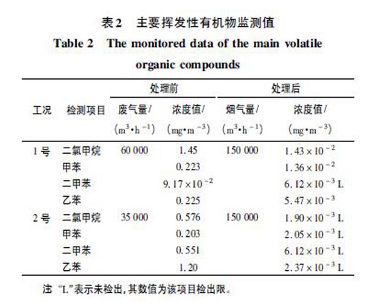 由第三方寧波市華測檢測技術有限公司對“揮發性有機物”指標進行了監測,監測方法參照《空氣與廢氣監測分析方法》(第四版增補版),報告編號為HLNBF00005883a,處理前后廢氣中主要揮發性有機物的濃度見表2。