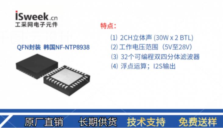 以下介紹一款由工采網代理的韓國NF-QFN封裝內置DSP雙通道音頻功放IC-NTP8938
