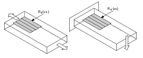 圖2. 軸向應(yīng)變測(cè)量材料如何拉伸或收縮。彎曲應(yīng)變測(cè)量一端拉伸,另一端收縮。