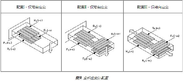 全橋應(yīng)變計(jì)配置包含四個(gè)工作應(yīng)變計(jì)和三種不同類(lèi)型。 類(lèi)型1和2測(cè)量彎曲應(yīng)變,類(lèi)型3測(cè)量軸向應(yīng)變。 只有類(lèi)型2和3補(bǔ)償泊松效應(yīng),但所有類(lèi)型都會(huì)小化溫度的影響。