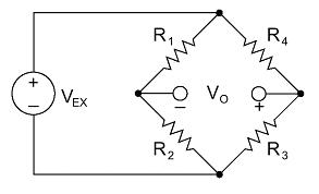為測(cè)量如此小的電阻變化,應(yīng)變計(jì)配置基于惠斯通電橋的概念。 常見(jiàn)的惠斯通電橋由四個(gè)相互連接的電阻臂和激勵(lì)電壓VEX組成,如圖4所示。