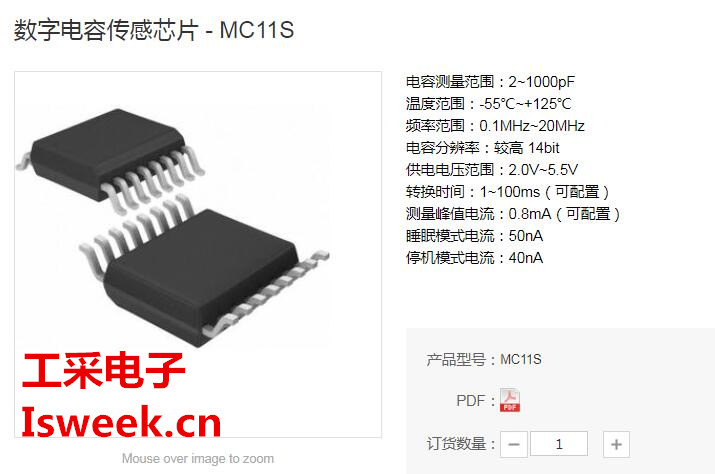 這里小編推薦一款由工采網(wǎng)代理的國產(chǎn)品牌MYSENTECH推出的電容傳感芯片,數(shù)字電容傳感芯片 - MC11S,該芯片是高集成度雙通道電容型傳感芯片,芯片直接與被測物附近的差分電容極板相連,通過諧振激勵并解算測量微小電容的變化。激勵頻率在0.1~20MHz范圍內(nèi)可配置,其頻率測量輸出為16bit數(shù)字信號,對應(yīng)的電容感知較高分辨率為1fF。芯片采用全數(shù)字化設(shè)計(jì),功能配置及數(shù)據(jù)讀寫支持較高1MHz的I2C通信速率。此外,芯片還集成了溫度傳感電路,可用于進(jìn)行溫度補(bǔ)償及其他溫度傳感場景。