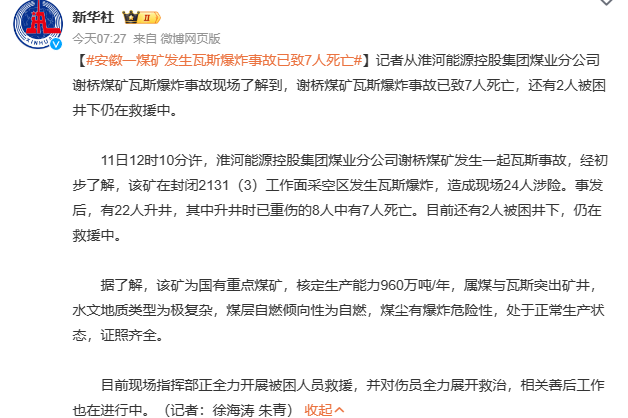 3月11日12時10分,安徽省淮河能源控股集團煤業分公司謝橋煤礦發生一起瓦斯事故,經初步了解,該礦在封閉2131(3)工作面采空區,發生瓦斯爆炸,造成現場24人涉險,事發后,有22人升井,其中升井時已重傷的8人中有7人死亡,目前還有2人被困井下,仍在救援中.