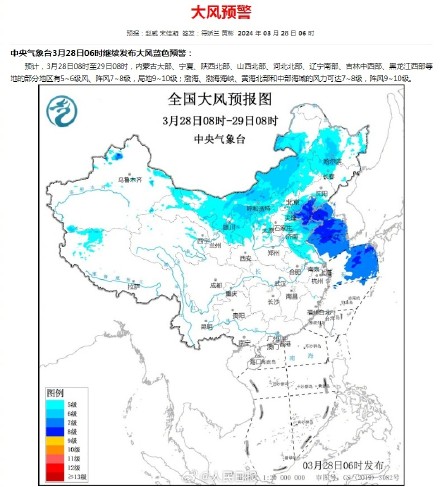 預計,28日08時至29日08時,內蒙古大部、寧夏、陜西北部、山西北部、河北北部、遼寧南部、吉林中西部、黑龍江西部等地的部分地區有5~6級風、陣風7~8級,局地9~10級;渤海、渤海海峽、黃海北部和中部海域的風力可達7~8級,陣風9~10級。