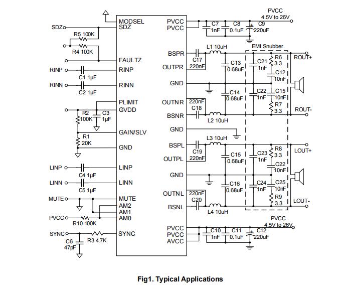 該芯片采用HTSSOP-32封裝;擁有新型的高效率調制模式(HEM)先進的EMI抑制技術;具備MUTE+擴頻+2.1聲道同步+跳頻;更小的諧波失真,極低的低噪聲,109的信噪比,更準、變化更小的頻率,失調電壓小1.5,開/關機噪聲小,224的靜態電流,極小的的關斷電流和導通電阻。