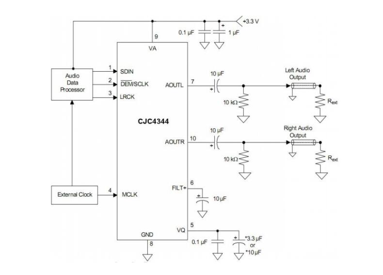 CJC4344含有數字去加重模塊,可以工作在3.3V 和5V下。這些特性使它成為DVD 播放解碼器、數字通信設備等無線設備的理想選擇。