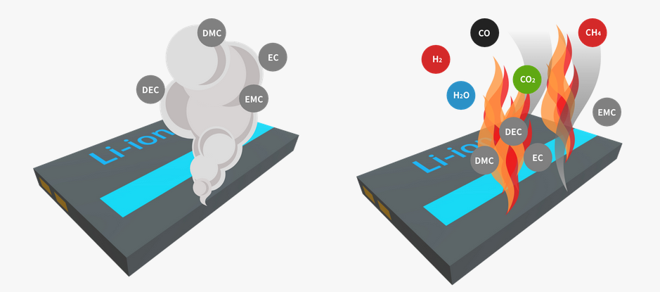 鋰離子電池(LIB)發生異常時,其產生的氣體主要成分除了氫氣(H2)、一氧化碳(CO)、甲烷(CH4)、二氧化碳(CO2)以外,還存在烴類VOC氣體(EMC、DMC、ECD等※)。