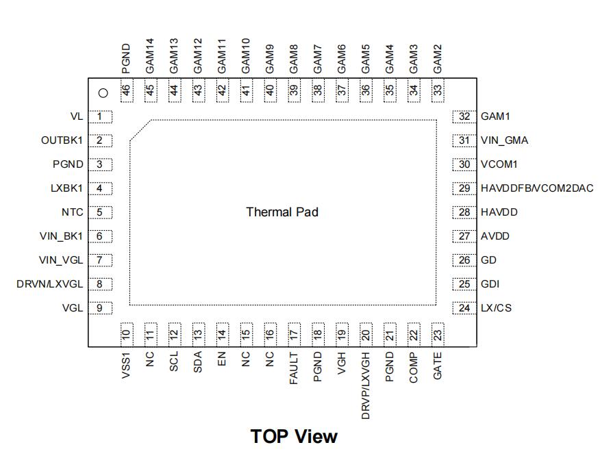 溫度補(bǔ)償輸入引腳。將NTC熱敏電阻和電阻連接到此引腳上,以控制VGH/VGL電壓的斜率,以進(jìn)行溫度補(bǔ)償。