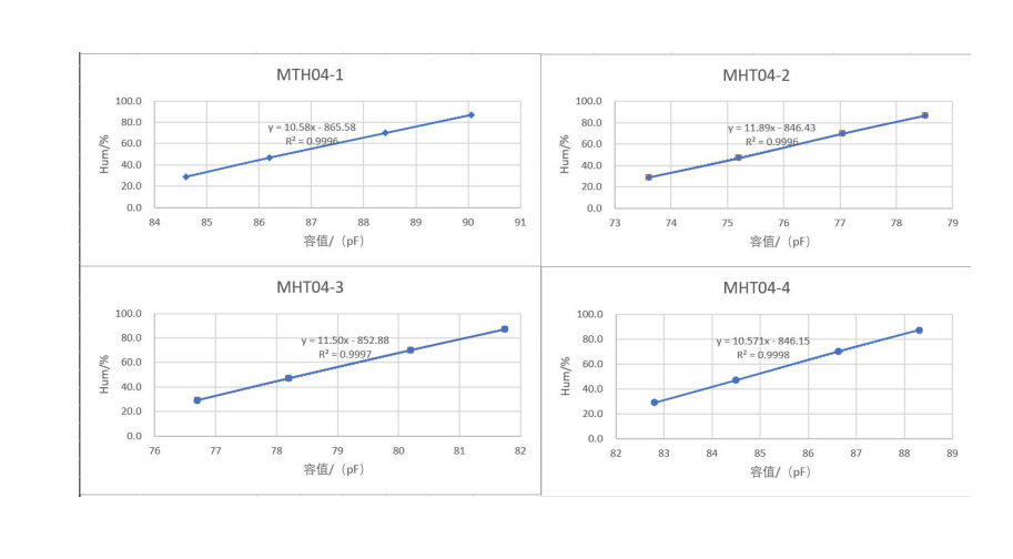 濕度特征曲線:針對(duì)不同濕敏電容探頭特性差異,模組出廠前會(huì)針對(duì)每個(gè)模組的特性曲線多點(diǎn)濕度校準(zhǔn)系數(shù)擬合,擬合結(jié)果如下圖所示。