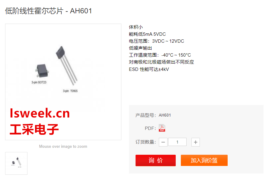 工采網代理的AH601是一款小型多功能經濟型的線性霍爾傳感器。工作原理是當磁場輸入時,輸出和輸入量是成比例變化電壓,靜態輸出電壓大小由電源電壓設定。該傳感器具有低噪聲輸出,無需外部濾波的特點。