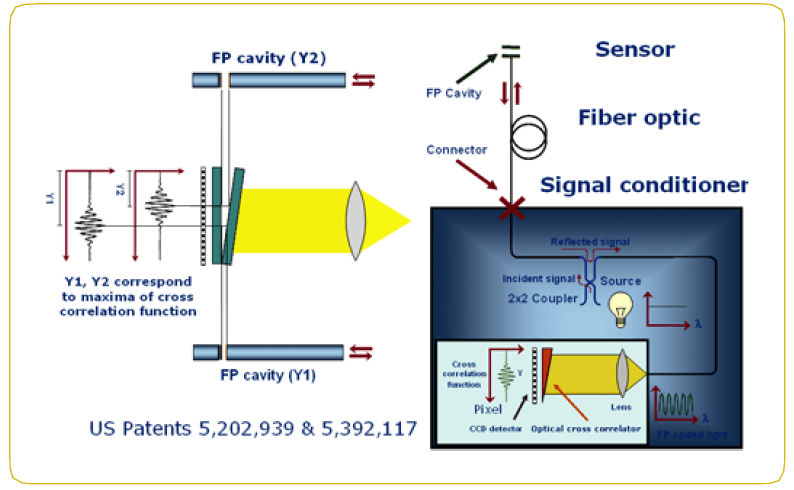如圖所示,寬帶光源發出的光發射到2x2耦合器的一個臂上,然后傳到FP儀。經由FP儀波長調制的光信號被反射回信號調理器,聚焦成一線,經白光正交相關儀傳輸之后,由線性CCD組合器檢測。白光正交相關儀就象一個立體分布的FP腔,其腔的長度沿著橫向位置而變。面對CCD組合器,每一個像素都與預定義的類似于FP的腔長度有關。因此儀器工作起來就像一臺立體長度可變的光學正交相關儀。例如,假定FP儀的腔長度為d微米, 由該FP儀所反射的光被傳送到d微米長度的CCD組合器的像素上,即立體分布的FP腔的橫向位置上長度為d微米。如圖所示,FP腔長度的變化被轉化成感應最大傳送值的像素的位移量。該技術提供了傳感器FP腔長度的測量。