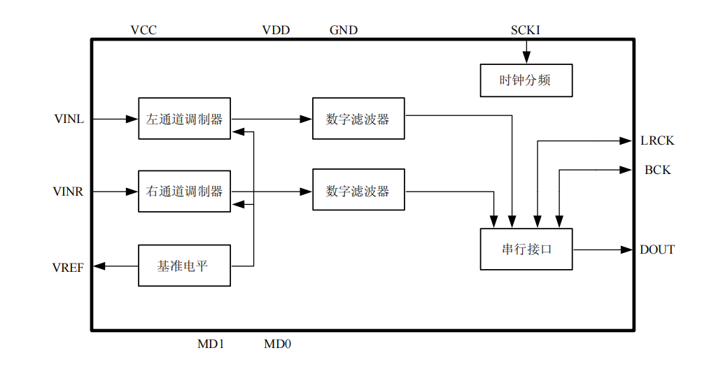 ADC輸入是單端而且內部通過20kΩ電阻偏置在共模電壓(50%*VCC)(典型@fs=48kHz)。輸入信號范圍隨著電源電壓擴張,正常情況為0.6*VCC Vpp(典型)。ADC輸出數據格式是二進制的補碼。內部高通濾波器消除直流失調電壓。