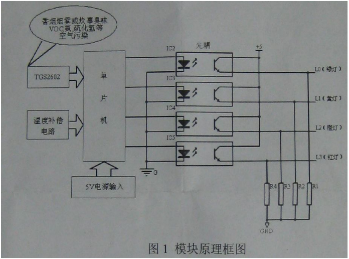 根據(jù) TGS2602 傳感器對 VOC、氨氣、硫化氫等空氣污染進行檢測,通過單片機對傳感器、溫度等信號處理并判斷污染等級,對應污染等級產(chǎn)生高電平輸出,實現(xiàn)對空氣質(zhì)量的檢測及控制功能