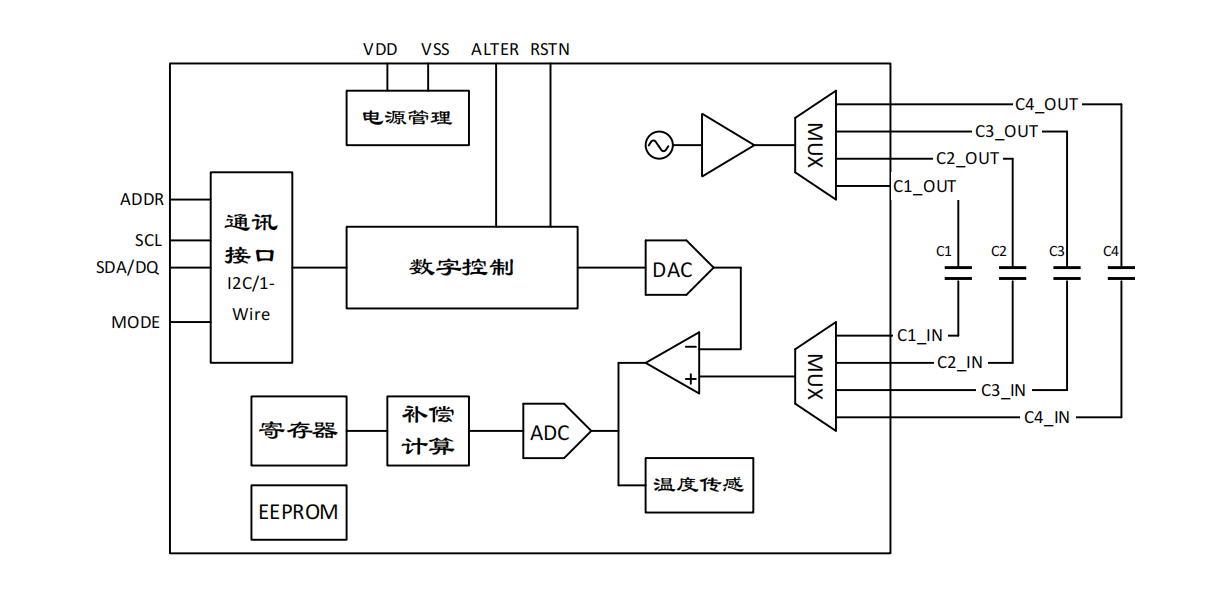 芯片內部集成高精度16bit模數轉換ADC電路,其電容分辨率為0.1fF,線性度誤差小于0.3%。此外,芯片內置精度0.5℃的溫度傳感電路,可用于溫度補償及其他溫度傳感場景。