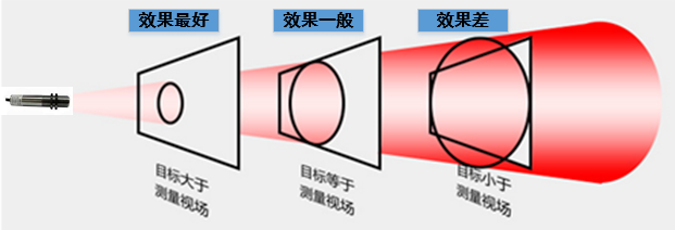 如果不考慮測量物體表面某一處的溫度,而是只要測量整個物體的平均溫度,那應確保被測物的直徑等于或大于被測區(qū)域尺寸。下圖中,矩形代表被測物體,其中左側(cè)的“被測物a”表面積大于在該距離上的被測區(qū)域尺寸,所以測量效果好。而“被測物b”由于離傳感器稍遠,它的面積恰等于被測區(qū)域尺寸,因而測量效果一般。即測溫儀同在測量背景物體,從而降低了讀數(shù)的精確性。“被測物c”則離傳感器太遠,以至其表面積小于被測區(qū)域尺寸,在這種情況下,除了被測物的紅外輻射能量外,傳感器還會收到其余的背景輻射能,從而大大降低了測量精度。