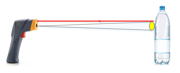 如下圖所示,紅外線溫度傳感器通常都自帶一個激光瞄準器(圖中的紅色直線表示激光),在使用時,激光瞄準處即為正在測量的部位。紅外線溫度傳感器的內(nèi)部有一凸透鏡,用來收集一定角度范圍內(nèi)被測物的紅外線輻射能,在圖中即為黃色圓形所示區(qū)域,因此它的測量結(jié)果實際上是被測物表面在該區(qū)域的平均溫度。