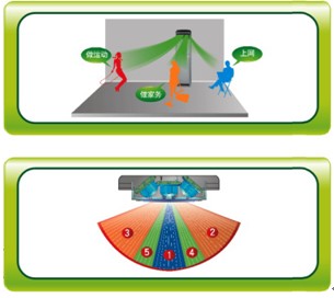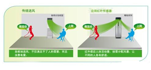 傳統的空調出風量和出風的位置是固定不變的,人們在房間的時候,空調的出風大小是不會改變的,這樣只能固定的出風,不僅滿足不了人們的需求,而且浪費電量,新型的智能傳感器安裝了利用紅外傳感器設計的動感儀,紅外溫度傳感器感應人體活動量,按需分配風量,讓不同的人各有舒適,空調上的動感儀可以對室內空間進行5區域的劃分,并實時監控5個區域,并在140度的大范圍實時監測和敏銳感知人體活動量并進行分區差異化按需送風,以此適應不同家庭成員的個性化使用需求,進而提高空調房間的整體舒適性。