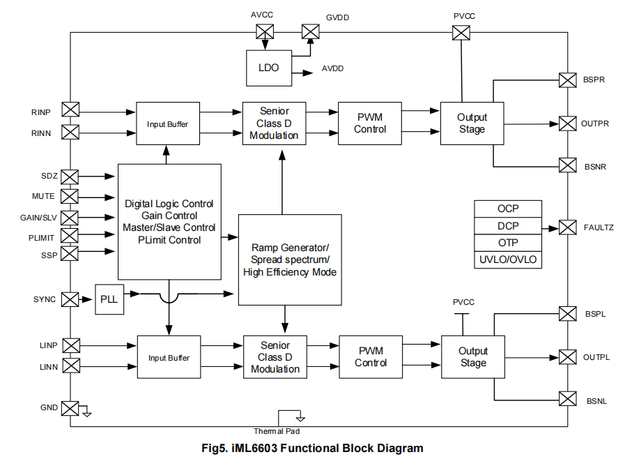 iML6603模擬功放芯片具有優異的性能、出色的音頻處理能力;供電電壓范圍:4.5V~26V(支持單、雙供電),支持兩種模式輸出:在雙通道BTL模式下,能夠輸出24V@2*30W/8Ω的功率;在單通道PBTL模式下,能輸出24V@60W/4Ω功率;小巧的封裝易于集成到各種音頻設備中,如音響、功放、無線音箱等。
