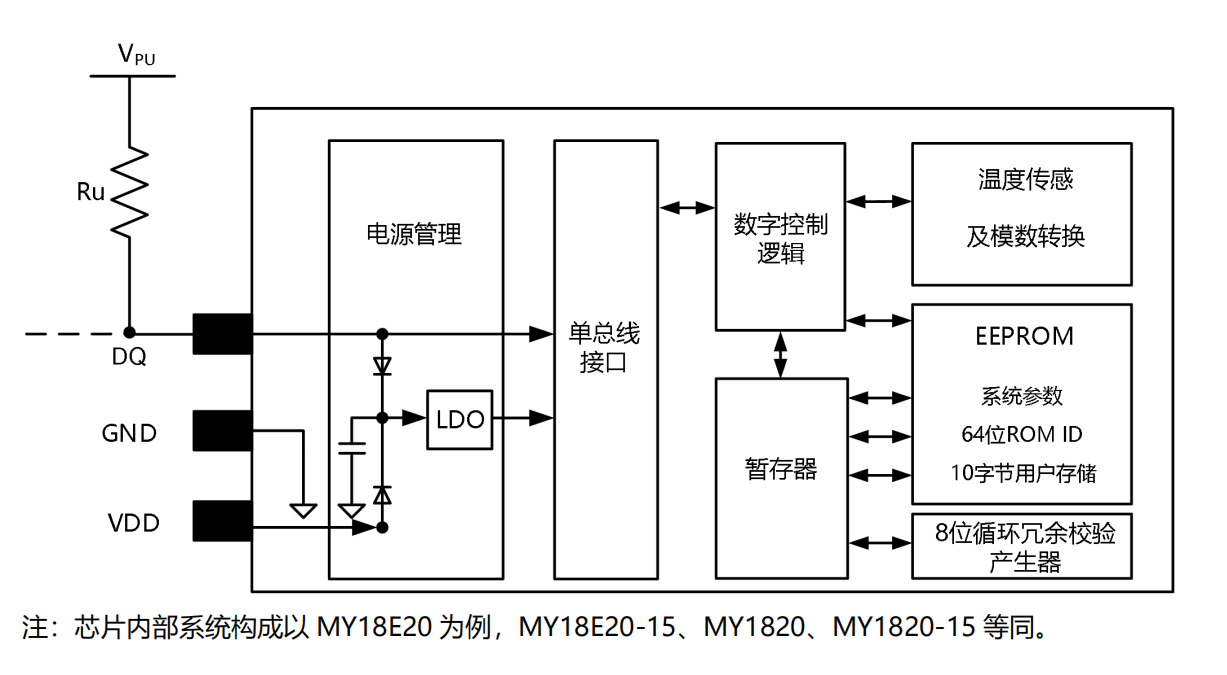 溫度芯片內(nèi)置14bit ADC,分辨率0.0125℃,默認(rèn)出廠配置12 bit ADC,工作范圍-55°C到+125°。芯片在出廠前經(jīng)過100%的測試校準(zhǔn),根據(jù)溫度誤差特性進(jìn)行校準(zhǔn)系數(shù)的擬合,芯片內(nèi)部自動(dòng)進(jìn)行補(bǔ)償計(jì)算。為了簡化系統(tǒng)應(yīng)用,芯片的ID搜索、測溫?cái)?shù)據(jù)內(nèi)存訪問、功能配置等均基于數(shù)字單總線協(xié)議指令,上位機(jī)微處理器只需要一個(gè)GPIO端口便可進(jìn)行讀寫訪問。單總線通信接口通過共用一根數(shù)據(jù)總線來實(shí)現(xiàn)多節(jié)點(diǎn)傳感采集與組網(wǎng)的低成本方案,傳輸距離遠(yuǎn)、支持節(jié)點(diǎn)數(shù)多,便于空間分布式傳感組網(wǎng)。較多可支持100個(gè)節(jié)點(diǎn)100至500米長的測溫節(jié)點(diǎn)串聯(lián)組網(wǎng)。