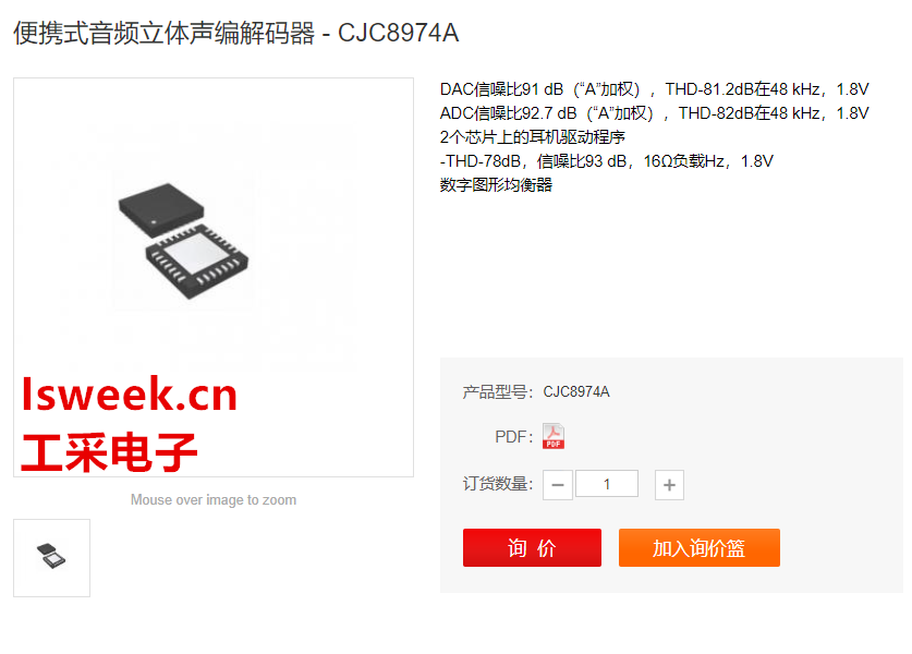 工采網(wǎng)代理的國(guó)產(chǎn)Codec芯片 - CJC8974A是一款低功率、高質(zhì)量的立體聲編解碼器,設(shè)計(jì)用于便攜式數(shù)字音頻應(yīng)用,以及一種單聲道橋接音頻功率放大器,在由5V電源供電時(shí),能夠?qū)?W的連續(xù)平均功率傳輸?shù)?Ω負(fù)載中,THD小于10%。