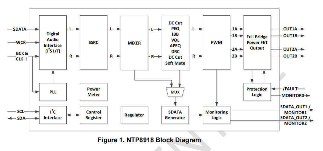 由工采網代理的NTP8918是一款高性能、高保真功率驅動集成全數字音頻放大器;內置DSP采用I2S輸出;可提供2x15W的輸出(BTL模式)或者30W的單通道輸出(PBTL模式)具備可靠性高、功率足、音色出眾、適應能力強等優勢。