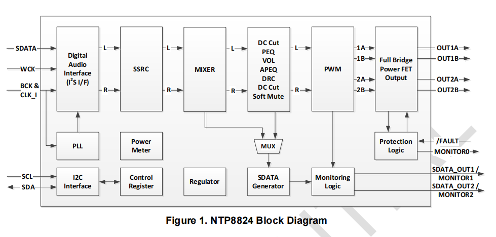 NTP8824接收32kHz、44.1kHz、48kHz和96kHz采樣頻率的數(shù)字串行音頻數(shù)據(jù)。它在立體聲模式下提供2x20W。
