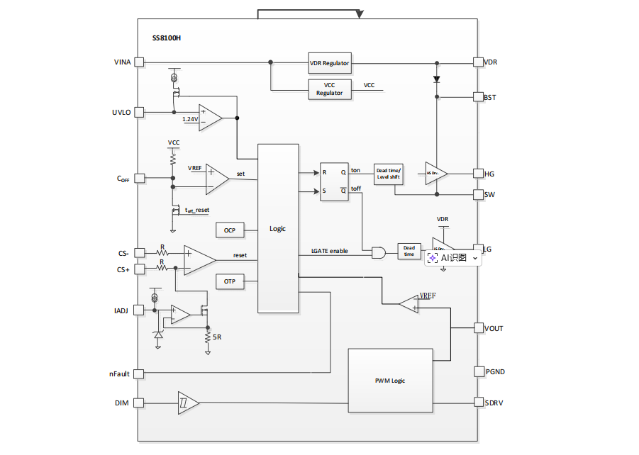 SS8100采用遲滯式恒定關(guān)斷時間的工作模式,無需添加外部補(bǔ)償設(shè)計(jì),使用方便。其輸出電流能力既可以通過不同阻值的外接電阻(Rcs)調(diào)整,也可以通過調(diào)節(jié)模擬調(diào)光控制引腳IADJ上的電壓來實(shí)現(xiàn)。電流能力可達(dá)15A以上。通過DIM管腳輸入PWM信號來靈活實(shí)現(xiàn)對LED的調(diào)光控制。