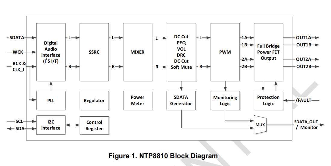 數字功放芯片NTP8810接收采樣頻率為96kHz、48kHz、44.1kHz和32kHz的數字串行音頻數據,立體聲模式下輸出功率為2×15W。該設備配備混頻器和雙四端濾波器,可用于實現關鍵音頻信號處理功能,如揚聲器響應補償和參數均衡。