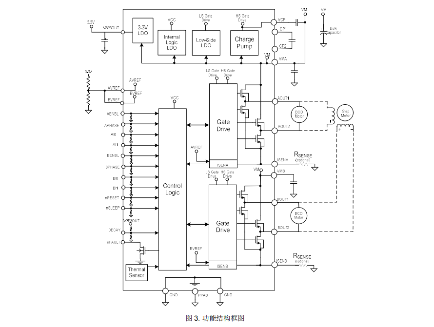 繞組電流控制允許外部控制器調整提供給電機的可調電流。電流調整是高度可配置的,以及根據應用程序的要求選擇三種衰變模式:快、慢和混合衰減。兩位電流電平控制允許在四種不同電流電平之間切換。當電機不工作時,采用低功耗的睡眠模式允許系統節省功耗。