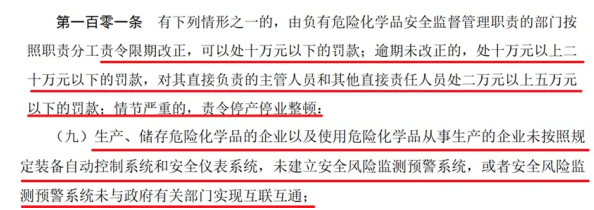 法律要求:第三十六條規定,危險化學生產、儲存企業必須按國家標準裝備自動控制系統、安全儀表系統,并建立安全風險監測預警系統,且需與政府監管平臺互聯互通。