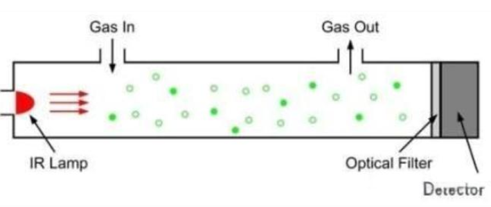 NDIR(非色散紅外)技術的原理是氣體對特征紅外波長的吸收符合朗伯比爾(Lambert-Beer)定律。其基本原理是紅外光源發(fā)射一道紅外光束穿過采樣氣室,樣本中的各氣體組分吸收特定頻率的紅外線。通過探測器接收和測量相應頻率的紅外線吸收量,結合嵌入式軟件中設置的算法分析,可確定該氣體組分的濃度。之所以說這種技術是非分光的,系因穿過采樣氣室的波長未經預先濾波。