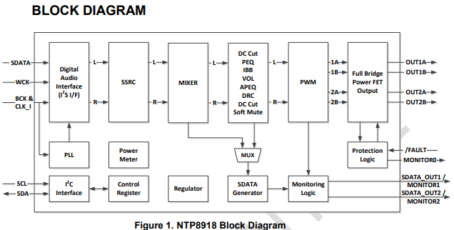NTP8918是韓國NF(NeoFidelity)推出的一款高性能、高保真全數字音頻放大器芯片,支持2×15W雙聲道(立體聲)輸出,32kHz、44.1kHz、48kHz 和96kHz采樣率的數字音頻輸入,集成音頻信號處理、PWM調制,內置豐富的音頻處理功能,包括混音器、雙二次濾波器、智能低音增強、動態范圍控制及多重保護機制,適用于多種高保真音頻應用場景。