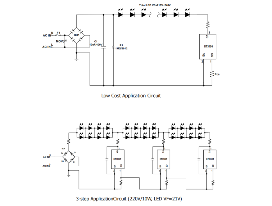 DT3100采用浮動電流驅動架構,可作為電壓控制電流源、電流調節器或截止器使用,支持LED串的串聯或并聯配置,其驅動電流可達150mA,且無需外接電解電容器和電感元件,獨特的電流調節機制,實現功率因數>0.9及總諧波失真(THD)<15%符合照明對能效和電磁兼容性的要求。