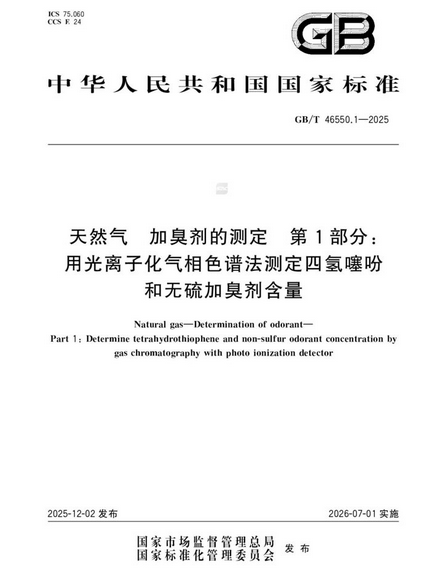 國家最新標準《GB/T 46550.1-2025 天然氣 加臭劑的測定 第1部分:用光離子化氣相色譜法測定四氫噻吩和無硫加臭劑含量》是由國家標準委于2025年12月2日發布,將于2026年7月1日起實施,旨在規范天然氣中特定加臭劑——四氫噻吩及無硫加臭劑濃度的檢測方法。該標準采用光離子化氣相色譜技術作為主要分析手段,通過此方法可以準確地測量出樣品中目標化合物的具體含量。