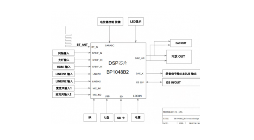 ?數字信號處理(DSP):利用?32位RISC內核 + DSP指令 + FPU?,對PCM信號進行實時處理,包括:采樣率轉換?(適配不同音頻源)、降噪、回聲消除(AEC)、噪聲抑制、音效增強?(如3D環繞、虛擬低音、EQ均衡、DRC動態范圍壓縮)、?防嘯叫、變調、變聲等特色算法?(如BP1048B2支持)?。
