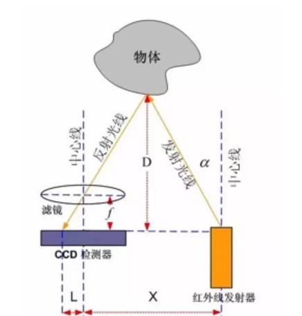 紅外測距都是采用三角測距的原理。紅外發射器按照一定角度發射紅外光束,遇到物體之后,光會反向回來,檢測到反射光之后,通過結構上的幾何三角關系,就可以計算出物體距離D。