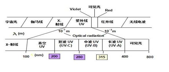 所謂的紫外線(Ultraviolet Rays/簡寫UV)就是指太陽光線的可視光線中(赤橙黃綠青藍紫),紫色之外的肉眼看不見的光線。紫外線是電磁波譜中波長從10nm到400nm輻射的總稱。根據波長的不同,一般把紫外線分為A、B、C三個波段,具體如下:UVA為400~315 nm,UVB為315~280 nm,UVC為280~100 nm。對應不同波長,具體應用有所不同。