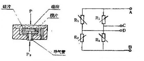 在硅膜片上則用半導體擴散工藝形成的四個橋路電阻布置成方形,當硅膜片受到壓力產生變形時,處于對角線上的二電阻受壓應力,而另為二個電阻受張應力,由于擴散硅的壓阻效應,使相對的二個電阻阻值增大,二另為二個電阻阻值減小。如果在A-A二端上加上電壓,則C-D間就有一個P-Po差壓成正比的電壓信號輸出。
