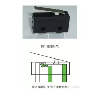 接觸式測(cè)障傳感器便是碰撞開(kāi)關(guān)(圖1)。碰撞開(kāi)關(guān)的工作原理非常簡(jiǎn)單,完全依靠?jī)?nèi)部的機(jī)械結(jié)構(gòu)來(lái)完成電路的導(dǎo)通和中斷。當(dāng)碰撞開(kāi)關(guān)的外部探測(cè)臂受到碰撞,探測(cè)臂受力下壓,帶動(dòng)碰撞開(kāi)關(guān)內(nèi)部的簧片撥動(dòng),從而電路的導(dǎo)通狀態(tài)發(fā)生改變(圖2)。