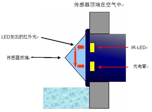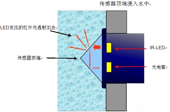光電液位傳感器是利用光在兩種不同介質(zhì)界面發(fā)生反射折射原理,是一種新型接觸式點(diǎn)液位測(cè)控裝置。在傳感器頭部有一個(gè)紅外LED和光電晶體管,精確地安裝在傳感器頂端的基座上。當(dāng)錐形端在空氣中時(shí),紅外光在內(nèi)部反射回光電管,在發(fā)射和接受之間光耦合特性良好。當(dāng)感應(yīng)端浸入液體時(shí),紅外光會(huì)從錐形表面透射出去,而光電管接受到的光強(qiáng)會(huì)變小,導(dǎo)致輸出電平發(fā)生變化。