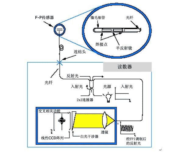 實(shí)際使用時(shí)將傳感器與讀數(shù)器(Demodulator)連接,讀數(shù)器中白光二極管光源發(fā)出的光從連接讀數(shù)器的光纖的一端入射,傳輸?shù)竭B接Fabry- Perot傳感器,再由多模光纖射出,照射在TFFI干涉儀(光楔)的表面。當(dāng)TFFI水平移動(dòng)時(shí),照點(diǎn)的位置也會(huì)不同。光楔上下兩個(gè)表面都鍍有半反射 膜,因而構(gòu)成了Fabry-Perot腔體。當(dāng)讀數(shù)器發(fā)射的白光的一部分被第一個(gè)半反射鏡反射后,其余的白光穿過(guò)Fabry-Perot腔體,且再一次被 第二個(gè)半反射鏡反射回來(lái),兩束反射光相互干涉,使得原來(lái)入射白光的光譜被調(diào)制。