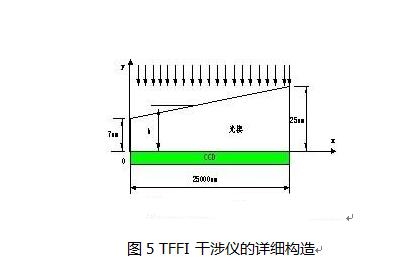讀數(shù)器中附帶了白光光源,從多模光纖返回的光經(jīng)過(guò)柱狀透鏡變?yōu)槠叫泄猓瑫?huì)投射在TFFI干涉儀的傾斜面上,而TFFI的下表面緊貼了一個(gè)對(duì)光強(qiáng)敏感的 CCD傳感器。如圖5所示,假設(shè)單色光均勻照射在光楔的上表面,則在x方向的每一點(diǎn),光楔上下表面的反射光會(huì)形成干涉,而下表面透射的光被CCD所檢測(cè)。