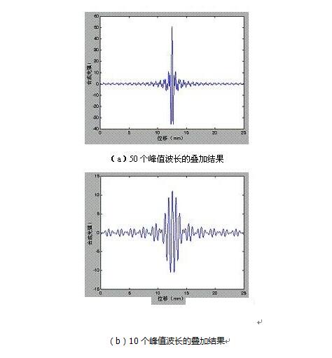 給解調(diào)干涉儀輸入圖3所示的調(diào)制光信號(hào)。為簡(jiǎn)單起見(jiàn),這里只考慮其中光強(qiáng)極大值對(duì)應(yīng)的波長(zhǎng)。這些波長(zhǎng)形成的干涉結(jié)果在CCD的長(zhǎng)度方向上進(jìn)行矢量疊加,由 于是白光干涉,所以疊加的次數(shù)越多,CCD上得到的干涉條紋越細(xì)銳。Matlab下的仿真結(jié)果如圖所示。