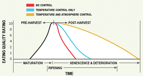 易腐爛的農(nóng)產(chǎn)品,比如水果、蔬菜之類的,他們一旦被采摘,還是會(huì)繼續(xù)產(chǎn)生代謝。這就意味著環(huán)境中的氧氣(O2)不斷被消耗同時(shí)會(huì)產(chǎn)生熱量,二氧化碳(CO2),濕氣,還有乙烯氣體的可能。植物逐漸成熟并分解成不良的狀態(tài)。