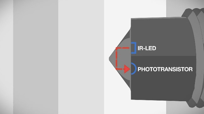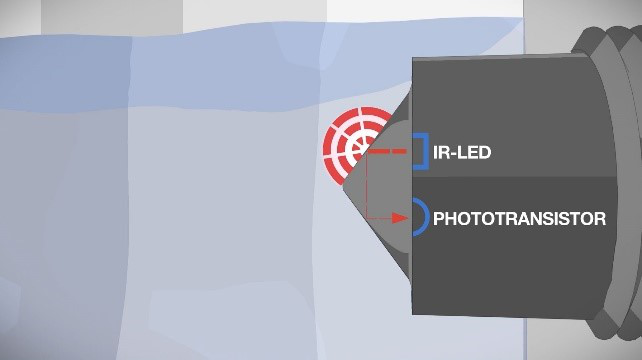 光學液位開關尖端的底部,精確的安裝著一個紅外LED和光電晶體管。當尖端處于空氣中時,來自LED的紅外光在尖端周圍反射,并回到光電晶體管。當開關的尖端浸入液體中時,紅外光從尖端逸出,導致到達光電晶體管的光總量發生變化,從而判斷有不同的介質介入,使得液位開關的輸出改變狀態(高電平變為低電平,或者相反。)